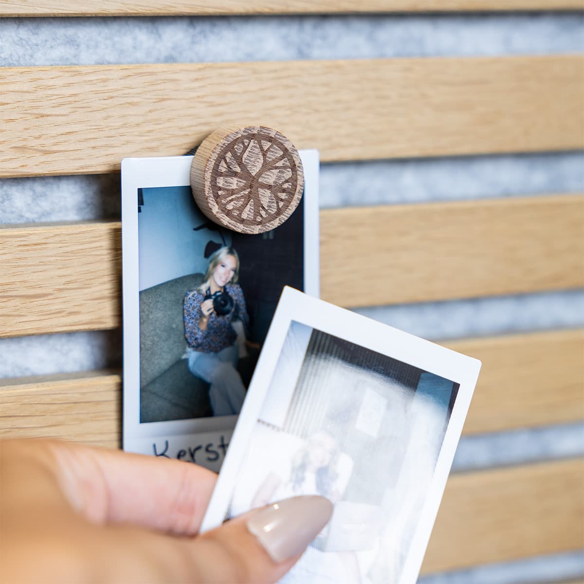 Aimants décoratifs en chêne pour accrocher posters, photos et gravures directement sur vos panneaux acoustiques.