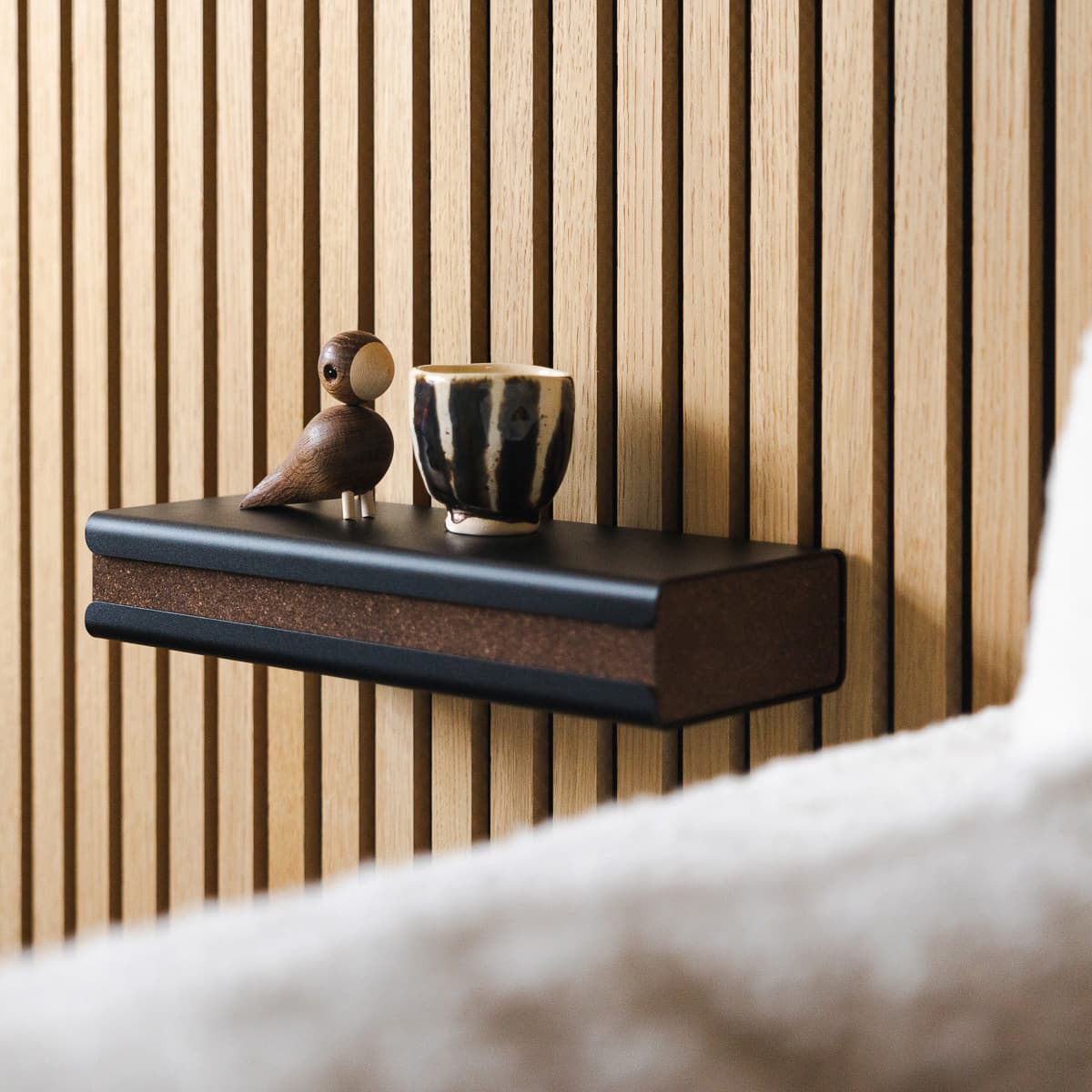Vide-poche en liège fumé intégré aux panneaux.
